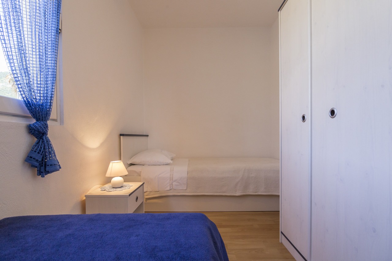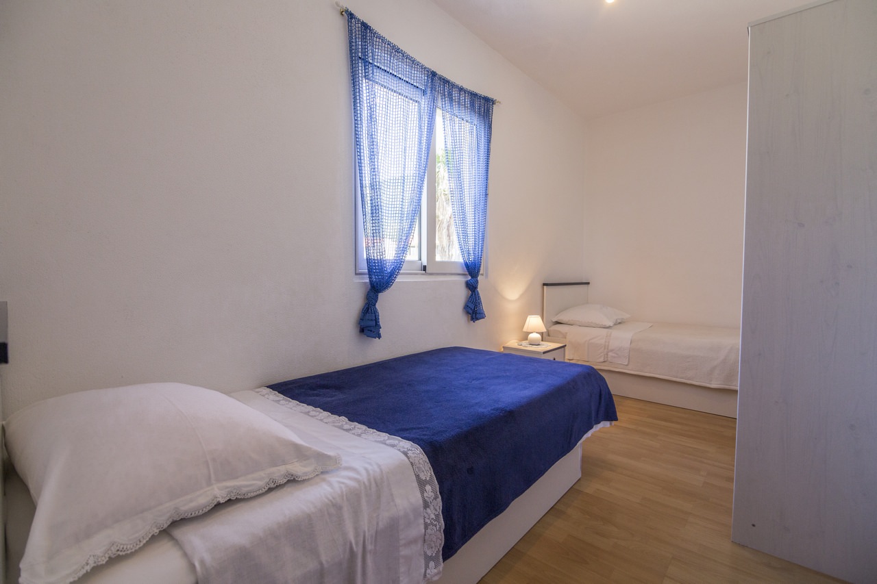 U sklopu apartmana nalaze se dvije spavaće sobe: jedna s bračnim krevetom, a druga s dva odvojena kreveta. U dnevnom boravku, na raspolaganju su Vam: TV, klima uređaj te kauč na razvlačenje, koji služi i kao pomoćni ležaj za dvije osobe.