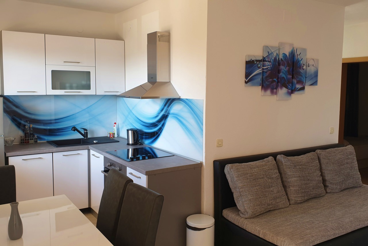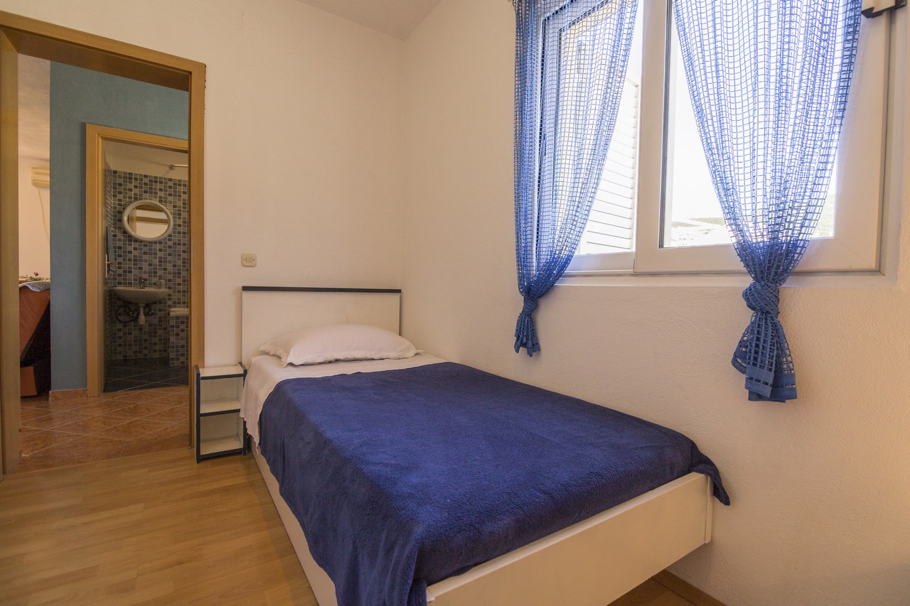 Apartman Plavi je apartman za 4 osobe (plus 2). Nalazi se na prvom katu Vile Katina i veličine je 50 m2 + 15 m2 balkona. Apartman je od mora udaljen samo 100 metara zračne linije.